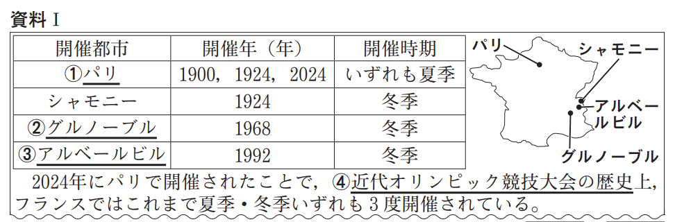 右の資料Ⅰは,舞さんが,フランスで開催された近代オリンピック競技大会について調べてまとめたものの一部である。これを見て,次の問い( 1 )~( 5 )に答えよ。