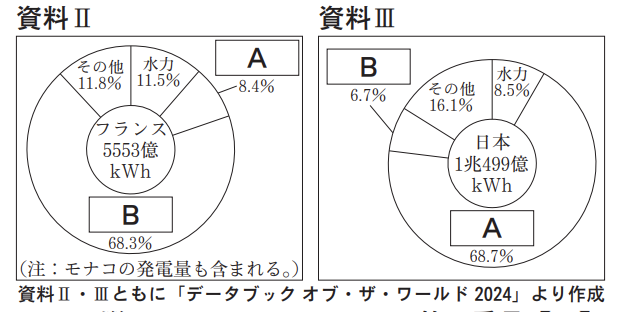 (2)下線部②グルノーブルは,ヨーロッパの中央部で東西に連なる山脈のふもとにある。その山脈として最も適当なものを,次のⅰ群(ア)~(エ)から 1 つ選べ。また,舞さんは,グルノーブルでは豊富な水力を利用した発電が盛んであることを知り,フランスと日本の発電量の内訳を比較した。右の資料Ⅱは2021年におけるフランスの発電量の内訳を,資料Ⅲは2021年における日本の発電量の内訳を,それぞれ示したものである。資料Ⅱ・Ⅲ中の[A]・[B]にそれぞれ共通して入る語句の組み合わせとして最も適当なものを,下のⅱ群(カ)~(サ)から 1 つ選べ。
