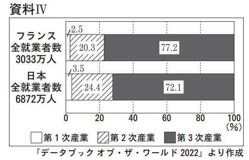 (5)舞さんは,20世紀後半以降,近代オリンピック競技大会の開催にともなって,道路の建設が進むなど,産業が受ける影響が大きくなっていることを知った。右の資料Ⅳは,2018年におけるフランスと日本のそれぞれの全就業者数及び産業別人口の割合を,舞さんがまとめたものである。資料Ⅳから読み取れることとして最も適当なものを,次の(ア)~(エ)から 1 つ選べ。また,日本において建設業は第何次産業に分類されるか,数字で書け。