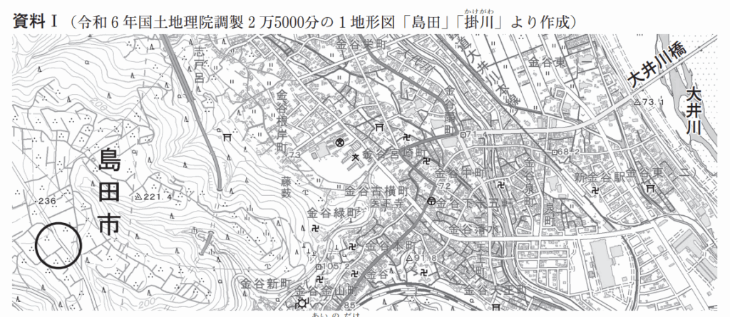都さんは,自分が住んでいる静岡県島田市についてさまざまなことを調べた。右の資料Ⅰは,島田市の 2 万5000分の 1地形図の一部である。これを見て,次の問い( 1 )~( 5 )に答えよ。