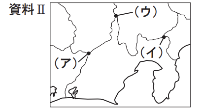 (1)資 料 Ⅰ中の「 大井川」 は,静岡県,長野県及び山梨県の 3 県の県境が 1 か所に集まる地点の近くにある間ノの岳を源流として,太平洋に流れ出ている。右の資料Ⅱは,静岡県とその周辺の都道府県の一部を表した略地図である。静岡県,長野県及び山梨県の 3 県の県境が 1 か所に集まる地を,資料Ⅱ中の(ア)~(ウ)から 1 つ選べ。また,次の(カ)~(ケ)のうち,中部地方の山岳地域から太平洋に流れ出ている川を 1 つ選べ。