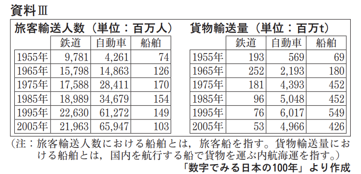 (4) 都さんは,資料Ⅰ中に鉄道路線があることに気づき,人や貨物を運び,私たちの生活を支える交通機関に興味を持った。右の資料Ⅲは,鉄道,自動車及び船舶の 3 つの交通機関について,1955年から2005年までの10年ごとの,日本国内の旅客輸送人数と貨物輸送量の推移を,それぞれまとめたものである。資料Ⅲから読み取れることとして適当なものを,次の(ア)~(オ)からすべて選べ。
