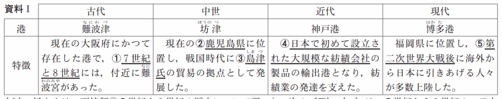次の資料Ⅰは,緑さんが,日本の歴史において重要な役割を果たした港について調べ,その特徴をまとめたレポートの一部である。これを見て,下の問い( 1 )~( 5 )に答えよ。