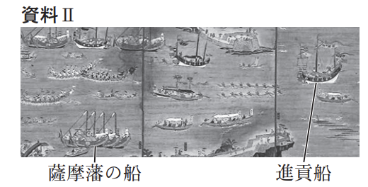 (3)緑さんは,下線部③島津氏が江戸時代に薩摩藩主となり,1609年に琉球王国を征服して支配したことを知った。右の資料Ⅱは,進貢船や薩摩藩の船が出入りする近世の那覇港のようすが描かれた 屏風の一部である。また,次の文章は,緑さんが資料Ⅱを参考にして,琉球が中国と続けてきた貿易と,その貿易に対して征服後に薩摩藩が行った管理についてまとめたものであり,文章中の[ ]に,下の(ア)~(コ)の語句から 4 つ選び,それらを並べかえてできた表現を入れると文章が完成する。[ ]に適切な表現が入るように,(ア)~(コ)の語句から 4 つ選び,それらを並べかえ,記号で書け。なお,[ ]に入る適切な表現は複数あるが,答案用紙には一通りだけ書くこと。