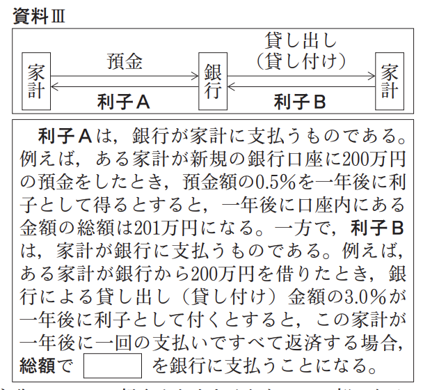 (4)緑さんは,下線部④日本で初めて設立された大規模な紡績会社が,明治時代に殖産興業政策に携わった渋沢栄一が中心となって設立した会社であることを知った。明治時代の日本について述べた文として最も適当なものを,次の(ア)~(エ)から 1 つ選べ。また,渋沢栄一は日本の金融のしくみを整えたことでも知られている。右の資料Ⅲは,家計が銀行に預金をしたときの利子の流れと銀行が家計に貸し出し(貸し付け)を行ったときの利子の流れを,緑さんが模式的に表したものであり,右の文章は,緑さんが資料Ⅲを参考にして,利子についてまとめたものである。文章中の[ ]に入る金額は何万円か,数字で書け。