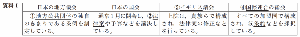 裕さんは,さまざまな議会や審議機関について調べ,発表することにした。次の資料Ⅰは,裕さんが発表のために作成した解説文の一部である。これを見て,下の問い( 1 )~( 5 )に答えよ。
