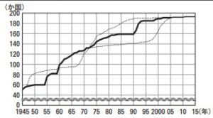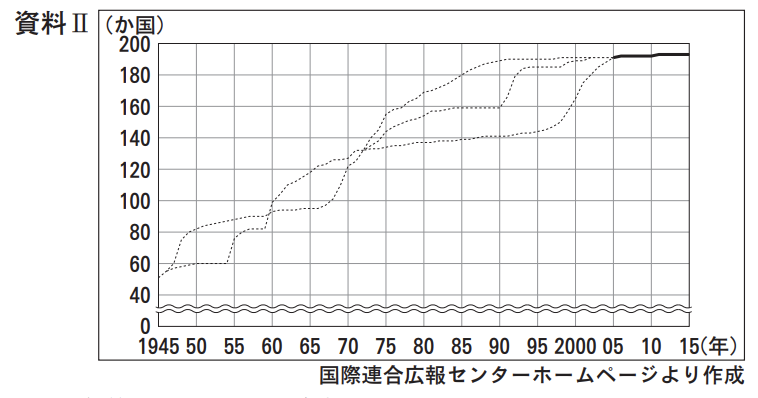 (4)裕さんは,下線部④国際連合の加盟国数の推移について調べた。次のメモは,国際連合が設立された1945年から2015年にかけての国際連合の加盟国数の推移と,その時代背景について裕さんが書いたものの一部である。また,右の資料Ⅱは,裕さんがメモを参考にして,1945年から2015年にかけての国際連合の加盟国数の推移を表そうとしたものであり,資料Ⅱ中の点線( ・・・・)をなぞるとグラフが完成する。答案用紙の図中に,1945年から2005年の間の,国際連合の加盟国数の推移にあたる点線をなぞって実線( ーーー)で示せ。