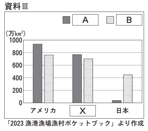 (5)裕さんは,下線部⑤条約のうち,国家の領域に関する条約について調べ,領海と排他的経済水域に注目した。右の資料Ⅲは,領海と排他的経済水域の面積の合計が世界で上位 2 位までに入る国と日本を比較するために, 3 か国それぞれの,領海と排他的経済水域の面積の合計及び領土の面積を裕さんが調べて作成したものである。資料Ⅲ中の[A]・[B]には,領海と排他的経済水域の面積の合計か領土の面積のいずれかが,[X]にはある国名が入る。[A]と[X]に入るものの組み合わせとして正しいものを,次の(ア)~(エ)から 1 つ選べ。