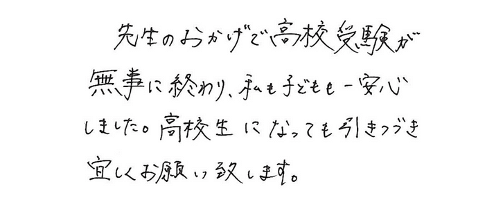 先生のおかげで高校受験が無事に終わり、私も子どもも一安心しました。高校生になっても引き続きよろしくお願い致します。