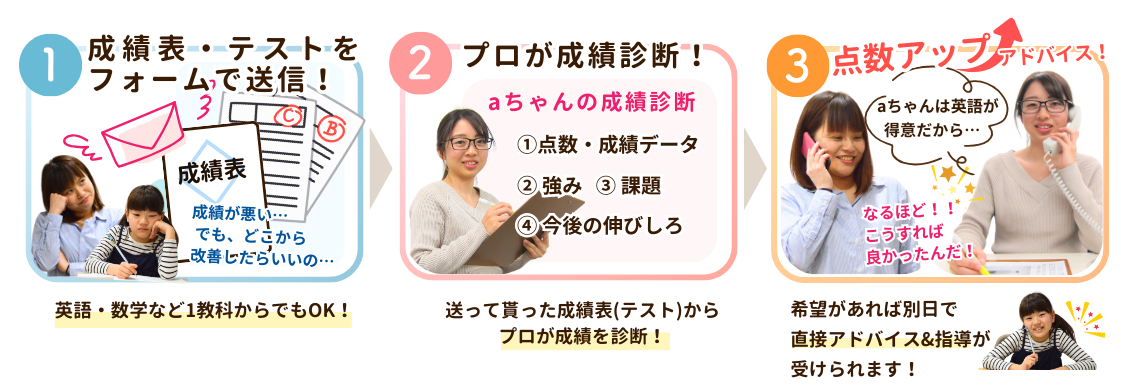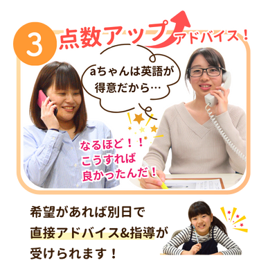 診断結果は、テストや成績表の内容に加え、普段の勉強の様子をお伺いしたうえで、お電話やオンラインにて、わかりやすくアドバイスをお伝えします。