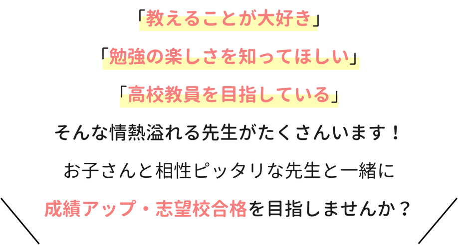 また、大学受験は大きなターニングポイントでもあり、お子さんにとっては精神的にも不安になりやすかったり、やる気が続かなかったり、と周りのサポートが大切になってきます。家庭教師のやる気アシストは、現役の学生も多く、お子さんの受験への不安や、モチベーションの面でも何かと共感できる部分が多いので、二人三脚で受験を乗り越えていけたらと考えています。