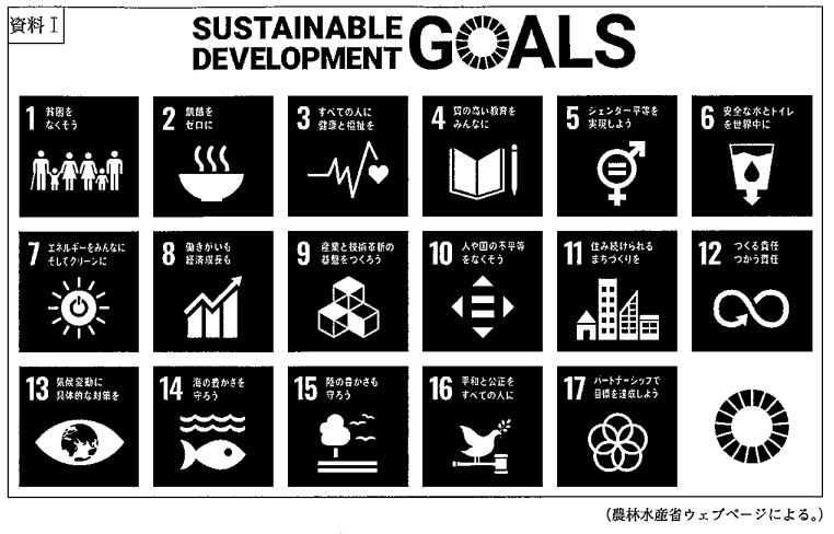 ある学級の社会科の授業で、「持続可能な社会を目指して、自分たちにできることを考える」というテーマで班ごとに分かれて学習をしました。次の資料Ⅰは、この授業のはじめに先生が提示した持続可能な開発目標(SDGs)の17の目標であり、下の会話は、その資料を基に、山本さんの班が話し合ったときのものです。あとの1~3に答えなさい。