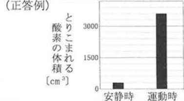 【実験1】 の結果と表から、肺で1分間にとりこまれる酸素の体積を、安静時と運動時でそれぞれ求め、右の図に棒グラフで表しなさい。