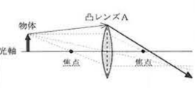 (1)図5は、実験1で物体から凸レンズAを通る光の進み方の一部を模式的に示したものであり、光軸 (凸レンズAの軸) 上にある2つの●は凸レンズAの焦点の位置を示している。