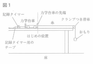(b) 力学台車を図1のように置き、 動かないように手でとめた後、