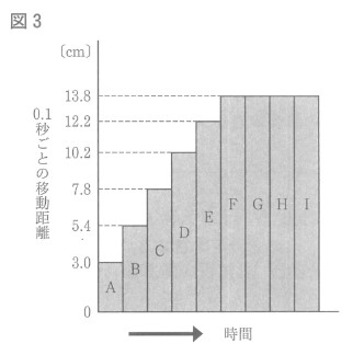 図2は、 力学台車の動きが記録されたテープの一部であり、打点が重なり合って判別できない点を除いて、基準点を決めた。 図3は、 力学台車の動きが記録されたテープを基準点から 0.1秒 ごとに切り、グラフ用紙に並べてはりつけ、テープの基準点側から順に区間A~Iとした。