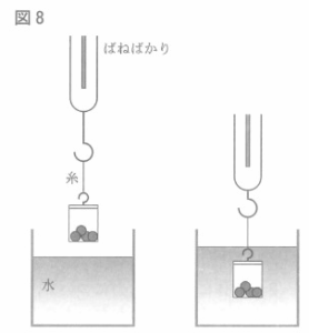 (b) 図8のように、実験2のばねを用いて作成したばねばかりに容器を つるし、 水中にゆっくりと沈めていき、水面から容器の下面までの距離とばねばかりが示した値を表にまとめた。