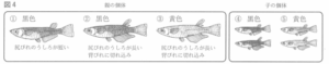 (4) メダカの体色は、 顕性形質である黒色の体色を現す遺伝子Rと、潜性形質である黄色の体色を現す遺伝子rの一組の遺伝子によって決まるとされている。図4の①〜③の3匹のメダカをかけ合わせると、④、⑤のように、黒色または黄色の両方のメダカが複数生まれた。