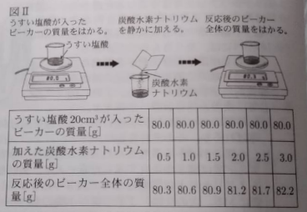 実験Ⅲ.次の図Ⅱのように,うすい塩酸20㎤が入ったビーカーの質量を電子てんびんではかった。次に,そのうすい塩酸に炭酸水素ナトリウムを静かに加えて反応させたところ,気体が発生した。気体が発生しなくなったあと,反応後のピーカー全体の質量をはかった。この方法で,うすい塩酸20㎤に対して,加える炭酸水素ナトリウムの質量を,0.5g,1.0g,1.5g,2.0g,2.5g,3.0gにして,それぞれ実験した。あとの表は,その結果をまとめたものである。