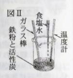実験Ⅱ.鉄粉と活性炭をビーカーに入れてガラス棒で混ぜ,温度計で温度をはかった。そのときの物質の温度は23.0℃であった。次に,右の図Ⅱのように,ビーカー内に食塩水をスポイトで5,6滴加えガラス棒でかき混ぜると,反応が起こって物質の温度が上がった。最も高くなったときの物質の温度は75.0℃であった。