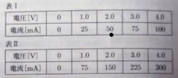 実験Ⅰ.次の図Ⅰのように電熱線Pと電熱線Qをつないだ装置を用いて,電熱線Pと電熱線Qに加わる電圧と流れる電流の関係を調べた。まず,電熱線Pに加わる電圧と流れる電 流を調べるために,図Ⅰのスイッチ①だけを入れて電圧計と電流計の示す値を調べた。下の表Ⅰは,その結果をまとめたものである。次に,図Ⅰのスイッチ➀とスイッチ②を入れ,電圧計と電流計の示す値を調べた。下の表Ⅱは,その結果をまとめたものである。