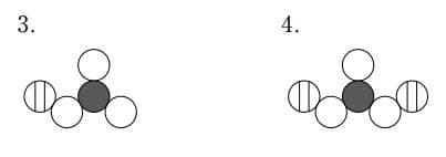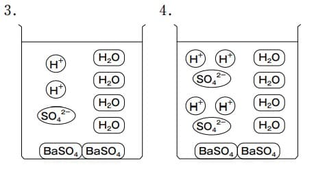 Kさんは,グラフ 2 の点A~Eにおけるビーカー内の水溶液中のようすを粒子のモデルで表した。図 3 は点Aにおけるモデルであり,次の 1 ~ 4 はそれぞれ点B~Eのいずれかにおけるモデルである。なお,粒子のモデルは化学式で表してあり,