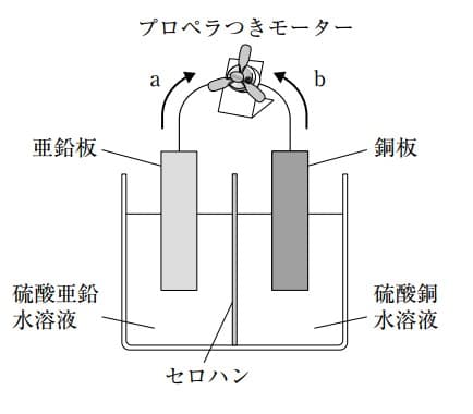 右の図のように,ダニエル電池とプロペラつきモーターをつないで電流を長時間流した。電流を流したあとの亜鉛板と銅板の質量をそれぞれ電流を流す前の質量と比較したところ,亜鉛板の質量は減少し,銅板の質量は増加していた。この電池について,次の(ⅰ),(ⅱ)として最も適するものをそれぞれの選択肢の中から一つずつ選び,その番号を答えなさい。