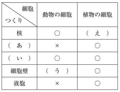 右の表は,動物の細胞と植物の細胞を顕微鏡で観察して,それらのつくりについてまとめたものであり,それぞれのつくりがみられる場合は○,みられない場合は×で示している。表中の( あ )~( え )にあてはまるものの組み合わせとして最も適するものを次の中から一つ選び,その番号を答えなさい。