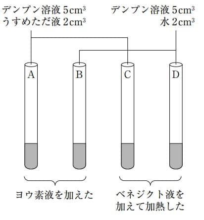 これら 4 本の試験管を 40℃の湯の中で 10 分間温めたあと,試験管AとBにヨウ素液を数滴加えたところ,試験管Bの溶液だけが青紫色に染まった。さらに,試験管CとDにベネジクト液を数滴加えて加熱したところ,試験管Cにだけ赤褐色の沈殿が生じた。