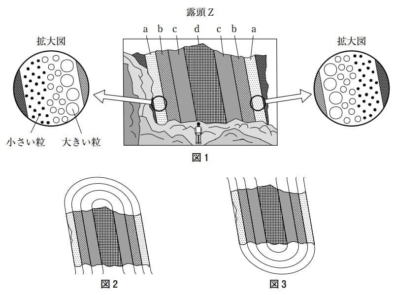 ある露頭Zを観察したところ,図 1 のようにa層~c層がd層をはさんで対称的に並んでいた。図 1のa層の 2 か所の〇で示した部分を近くで観察すると,拡大図に示したような粒の大きさの変化がみられた。資料を調べたところ,この地域の地層は堆積岩でできており,地層の逆転はないこと,また露頭Zはしゅう曲した地層の一部が見えているものであり,しゅう曲のようすは図 2 または図 3 のどちらかであるということがわかった。この地層ができたときの堆積の順序やしゅう曲のようすについての説明として最も適するものをあとの 1 ~ 4 の中から一つ選び,その番号を答えなさい。ただし,図 2 と図 3 には露頭Zの一部を示しており,その上下は図 1 と一致しているものとする。