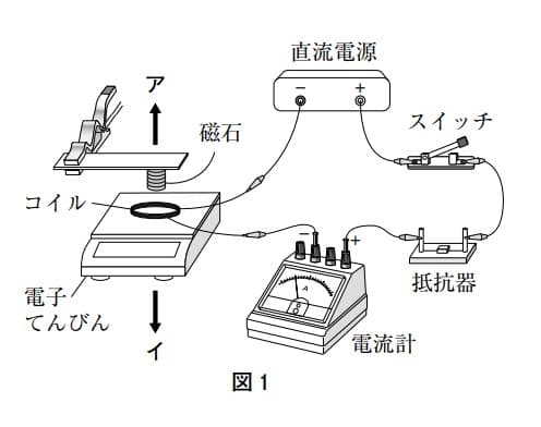 図 1 のように,直流電源,スイッチ,抵抗器,電流計,コイルをつなぎ,コイルを電子てんびんの上にのせ,コイルの真上にN極を下にした磁石を固定した。回路に流れる電流の大きさを変えながら,電子てんびんの示す値を調べた。表は,その結果をまとめたものである。