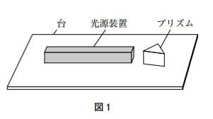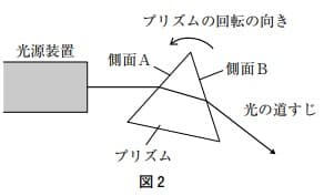 図 1 のように,水平な台の上に光源装置とガラスでできた三角柱のプリズムを置き,空気中で光源装置から出た光がプリズムを通りぬけるときの光の道すじを調べた。図 2 は,図 1 の一部を真上から示したものであり,プリズムの側面Aに入射し,側面Bから出ていく光の道すじを表している。