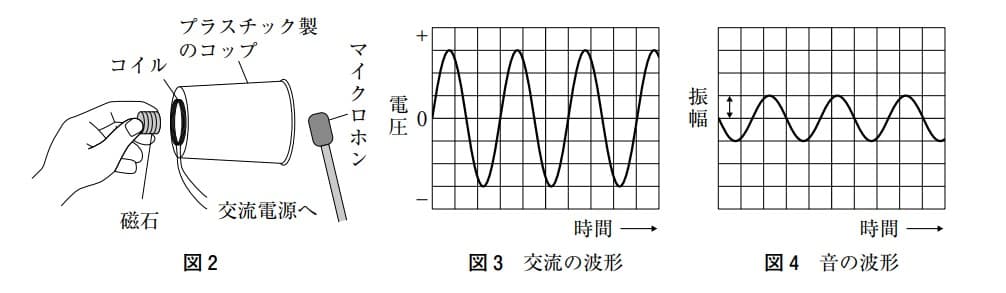 図 2 のように,プラスチック製のコップの底にはりつけたコイルを交流電源につないで交流を流し,磁石を近づけたところ,コイルを流れる電流が磁石のつくる磁界から力を受けてコイルが振動し,その振動がコップに伝わって音が出た。このとき,交流電源にオシロスコープをつないで表示した交流の波形と,コップから出た音を図 2 のようにマイクロホンで拾ってオシロスコープで表示した音の波形はそれぞれ図 3 と図 4 のようになった。