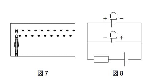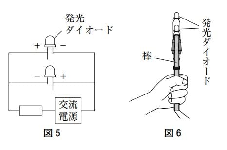 ① 図 5 の回路図のように交流電源と抵抗器につないだ 2 個の発光ダイオードを,図 6 のように棒に固定した。棒を持ってすばやく横に動かすと,図 7 のように 2 個の発光ダイオードが交互に点灯するようすがみられた。