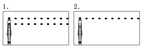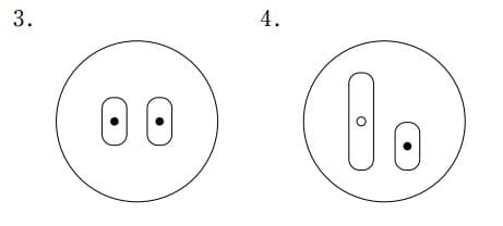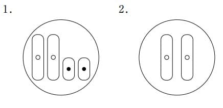 〔実験2〕について,Kさんは交流と直流のちがいを確認するために,〔実験3〕を行った。〔実験3〕の②における発光ダイオードの点灯のようすを表す図として最も適するものをあとの 1 ~ 4 の中から一つ選び,その番号を答えなさい。なお,図 7 および 1 ~ 4 では,発光ダイオードの点灯を黒い点や線で表している。