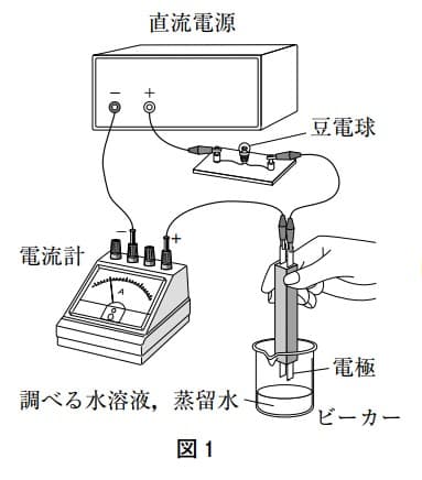 Kさんは,水溶液に流れる電流について調べるために〔実験1〕を行った。その結果から,「ある体積の水溶液を流れる電流の大きさは,その水溶液中のイオンの数が多いほど大きくなる」と考え,このことを利用して酸とアルカリを混ぜたときの水溶液の性質の変化について調べるために,〔実験2〕を行った。これらの実験とその結果について,あとの各問いに答えなさい。