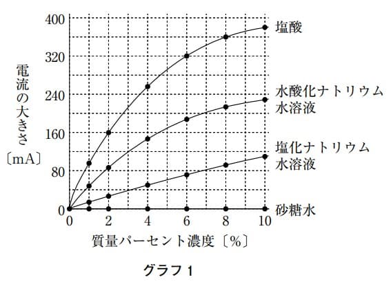 図 1 のような装置を用いて,塩酸,水酸化ナトリウム水溶液,塩化ナトリウム水溶液,砂糖水,蒸留水それぞれ 20cm3に一定の大きさの電圧をかけたときに流れる電流の大きさを測定した。蒸留水以外の水溶液における測定は,水溶液の質量パーセント濃度を 1.0%,2.0%,4.0%,6.0%,8.0%,10.0%と変えてそれぞれ行った。グラフ 1 は,その結果をまとめたものである。