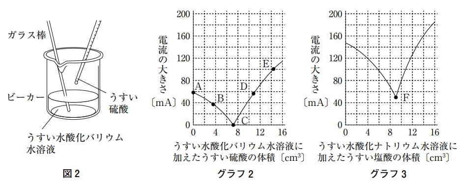 図 2 のように,うすい水酸化バリウム水溶液 20cm3を入れたビーカーに,うすい硫酸を少しずつガラス棒でよくかき混ぜながら加えた。このとき,うすい硫酸を一定量加えるごとに,〔実験 1 〕と同じ装置を用いてビーカー内の水溶液に〔実験1〕と同じ大きさの電圧をかけ,流れる電流の大きさを測定した。