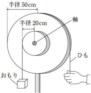 右の図のように,大きい滑車と小さい滑車の中心を重ねて固定し,2 つの滑車が同時に軸のまわりを回転するようにしたものを輪軸という。大きい滑車と小さい滑車の半径がそれぞれ50cm,20cm であるとき,小さい滑車につり下げた重さ 20Nのおもりをゆっくりと一定の速さで 30cm 引き上げるためには,大きい滑車につないだひもに( X )N の力を加えて( Y )cm 引き下げればよい。このとき,おもりを引き上げるために必要な仕事は( Z )J である。