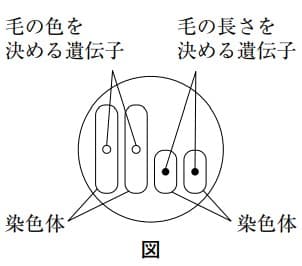 ⑦ 図は,モルモットの体細胞の染色体を模式的に示したものである。図のように,毛の色を決める遺伝子と毛の長さを決める遺伝子は別の染色体にある。