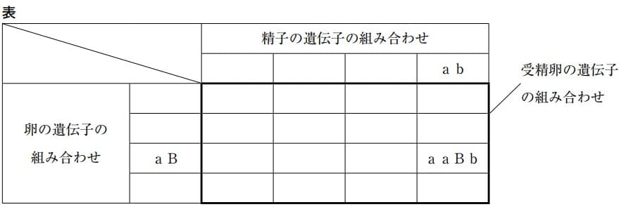 子と同じ遺伝子の組み合わせをもつものどうしを交配してできる孫の遺伝子の組み合わせを調べるためには,次のような表をつくるとよい。子がつくる精子や卵の遺伝子の組み合わせを表に書き入れると,受精卵の遺伝子の組み合わせが決まる。例として,精子の遺伝子の組み合わせがabで,卵の遺伝子の組み合わせがaBのとき,受精卵の遺伝子の組み合わせはaaBbとなる。
