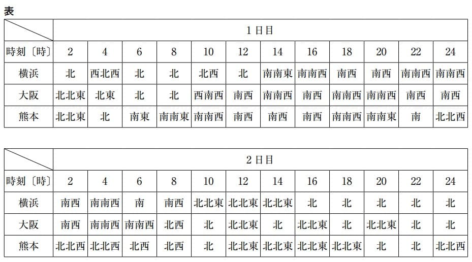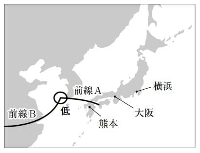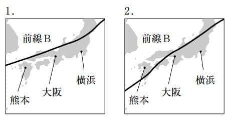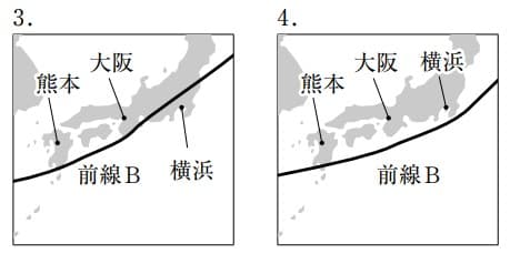 先 生 「この低気圧は,2 日目の 3 時には北海道の東の海上にあったことがわかっています。いま,私が前線Bの位置の候補として 1 ~ 4 の図を用意しました。表にある横浜,大阪,熊本の風向の変化から考えて,2 日目の 3 時における前線Bの位置を示す図を,1 ~ 4 の中から選んでください。」