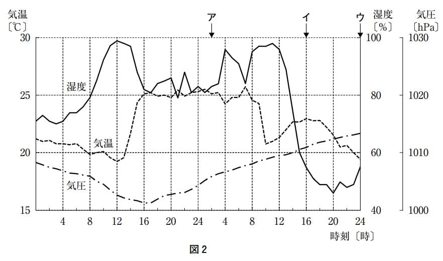 図 2 に示したア~ウの時刻(ア:2 日目の 2 時,イ:2 日目の 16 時,ウ:2 日目の 24 時)を,空気1m3 あたりの水蒸気量が多い方から順に並べたものとして最も適するものを次の中から一つ選び,その番号を答えなさい。