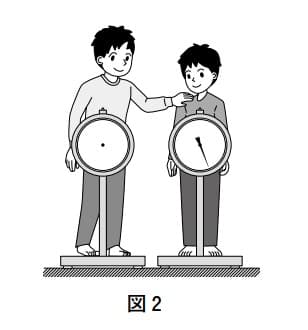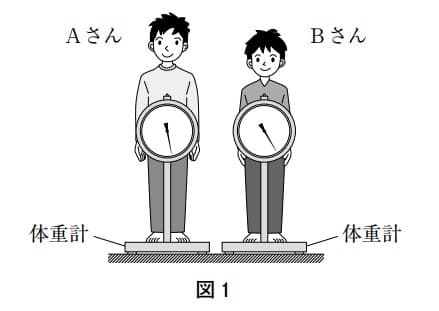 図 1 のように,AさんとBさんが体重計に乗ったところ,体重計の示す値はAさんが 57.5kg,Bさんが 52.5kg であった。次に,図 2 のように,AさんがBさんの肩に手をおいて,下向きの力を加えたところ,Bさんの体重計の示す値が 55.0kg になった。このとき,(ⅰ)Aさんの体重計の示す値,(ⅱ)Aさんの手がBさんの肩から受ける力の向きと大きさとして,最も適するものをそれぞれの選択肢の中から一つずつ選び,その番号を答えなさい。ただし,質量 100g の物体にはたらく重力の大きさは 1.0Nとする。