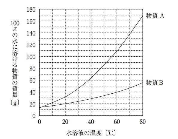 次の図は,物質Aと物質Bの溶解度を示したものである。80℃の水 100g に物質Aが 120g と物質Bが 30g 溶けている水溶液がビーカーに入っており,この水溶液の温度をしだいに下げ,70℃,50℃,30℃,10℃になったときにそれぞれビーカー内にある結晶を確認した。このとき,純粋な物質Aの結晶だけが確認できた温度として最も適するものをあとの 1 ~ 4 の中から一つ選び,その番号を答えなさい。ただし,混合物の水溶液中でも物質Aと物質Bの溶解度は変化せず,物質Aと物質Bは化学変化しないものとする。