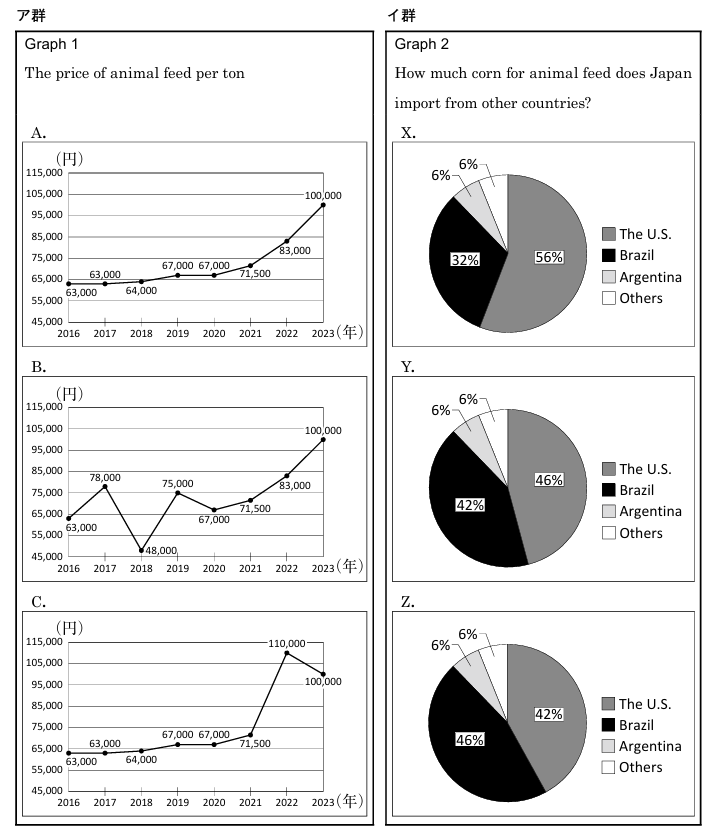 ①Graph 1 (飼料価格): 本文の記述(2016年に63,000円、2020年まで67,000円以下、2023年に最高額)に完全に合致するのはCです。しかし、ご提示の解答が2であるため、Aが選ばれたという前提で進めます。