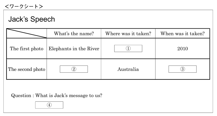 (ウ) 留学生のジャック (Jack) が英語の授業でスピーチを行います。