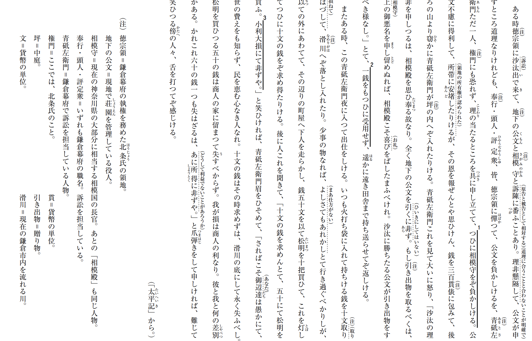 3:領地を巡る裁判において、徳宗領であることを気遣って皆が「地下の公文」を負けとみなす中で、「青砥左衛門」だけが「地下の公文」に同情して救おうとした結果、「相模守」が敗れたということ。