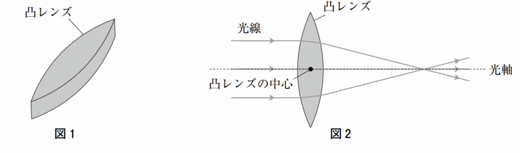 四角柱のガラスの中に,図1の凸レンズと同じ形の空洞があるもの。空洞の内部は空気で満たされている。