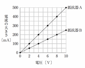 流の大きさを測定した。次に,抵抗器Aを抵抗器Bにかえて同様の実験を行った。右の図は,その